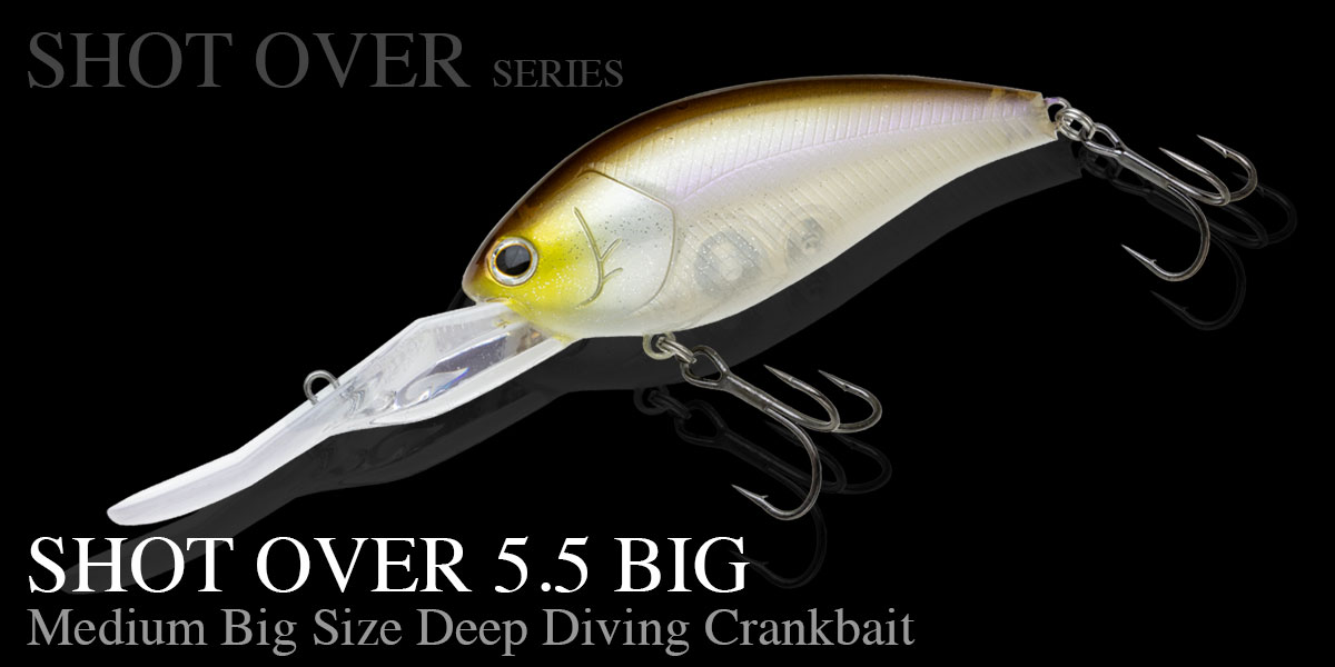 各地でビッグフィッシュに高い実績を誇る「ショットオーバー5」をベースに、さらなるビッグフィッシュ率を求めたのが「ショットオーバー5.5BIG」。ロングキャスト性能、優れた潜行能力、軽いリーリング感などオーバー5の特性を踏襲しながら、ボディーボリュームを絶妙にアップ。オーバー5よりも大きくストーミーマグナムよりも小さいサイズ感は、マグナムのように状況を選ばず専用タックルも必要としないため、あらゆる場面で投入することができます。アクションも信頼のオーバー5と同じタイトウォブルロールで、水質を選ばないオールコンディション対応。突出した根がかり回避能力とオーバー5よりも高い浮力を活かしてストップ&リーリングを使えば、柔らかなウィードやボトムの落ち葉などを上手く躱しながら引き切れるのもオーバー5.5の特別感を実感できる使用法です。ショットオーバーシリーズの特徴であるボディーとリップとを別成型し組み合わせる構造で、カラーによってボディーマテリアルをボーンホワイト系ABSとクリア系ABSを使い分け、これによりカラーに伴ってアクションやサウンドの差も生まれ、アピールの強弱という引き出しをさらに拡げています。信頼のショットオーバーシリーズに、新たな実績を積み上げるためのビッグフィッシュアイテムが「ショットオーバー5.5BIG」です。